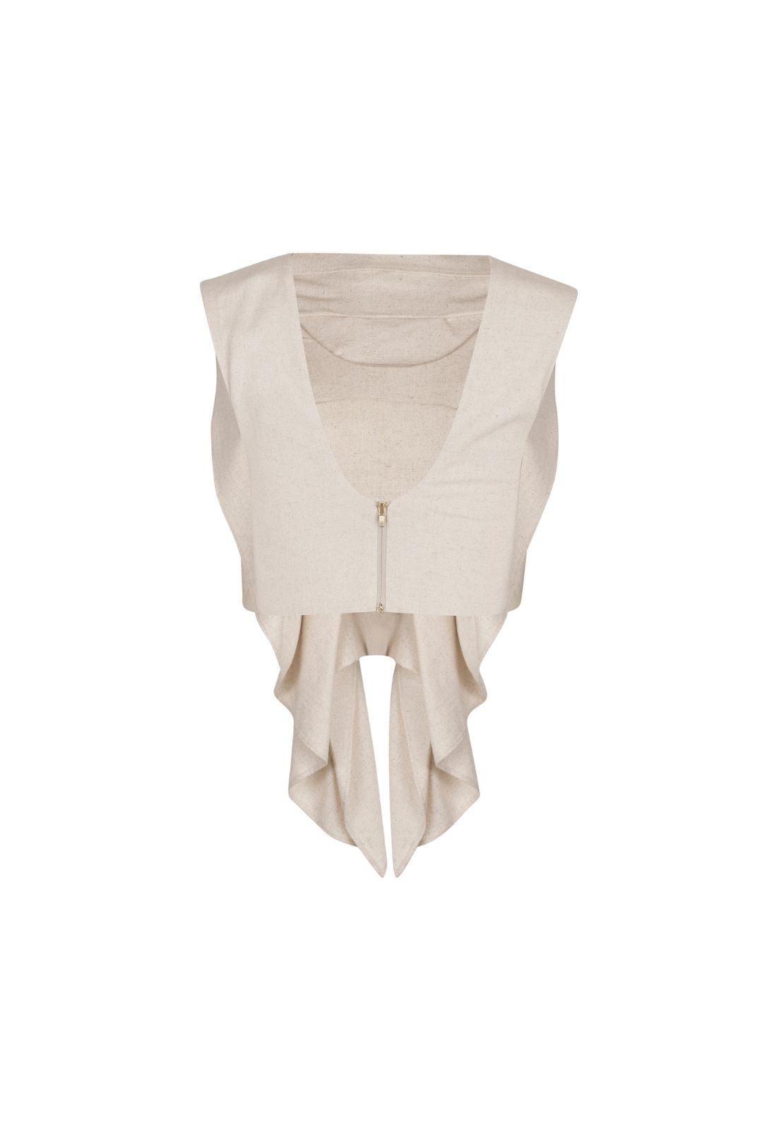 Sleeveless blouse with boat neck, draped at the front and U-neck at the back. Fully lined in the same fabric and a separating zipper at the back.