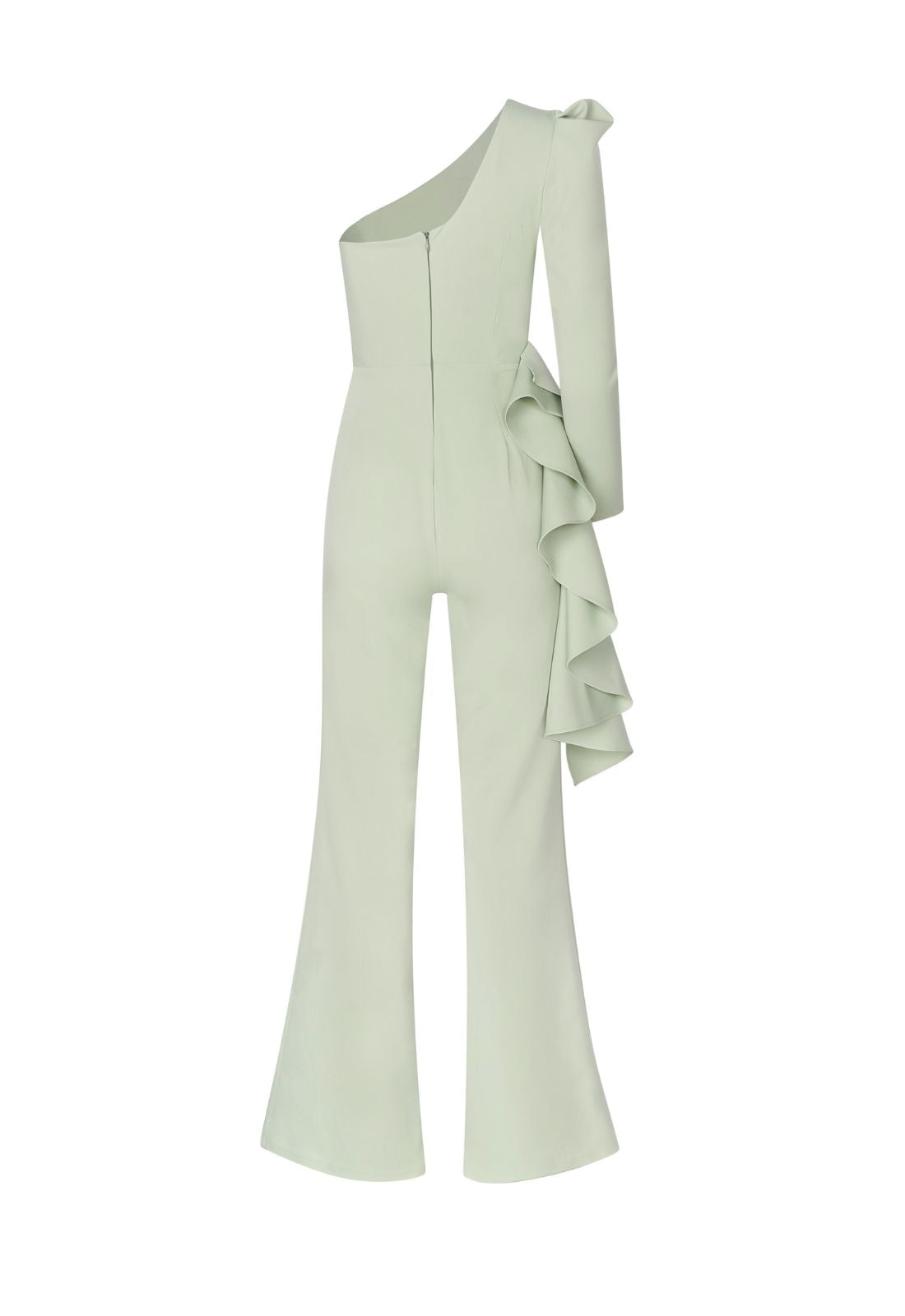 Enterizo medio hombro con manga larga, drapeado delantero y bota recta. Parte superior forrado en la misma tela, cortes con varilla para sostener el busto y cremallera invisible en la parte posterior.