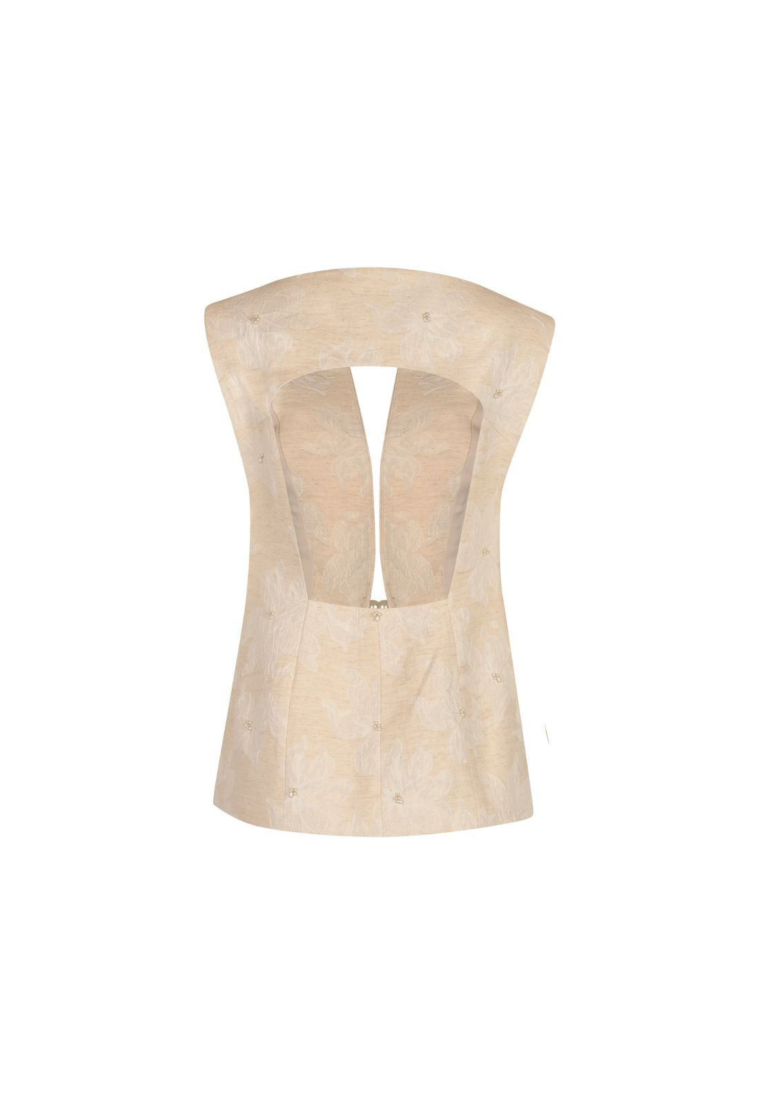 Chaleco en jacquard con escote en espalda y bordado en perlas. cierre con broche interno.