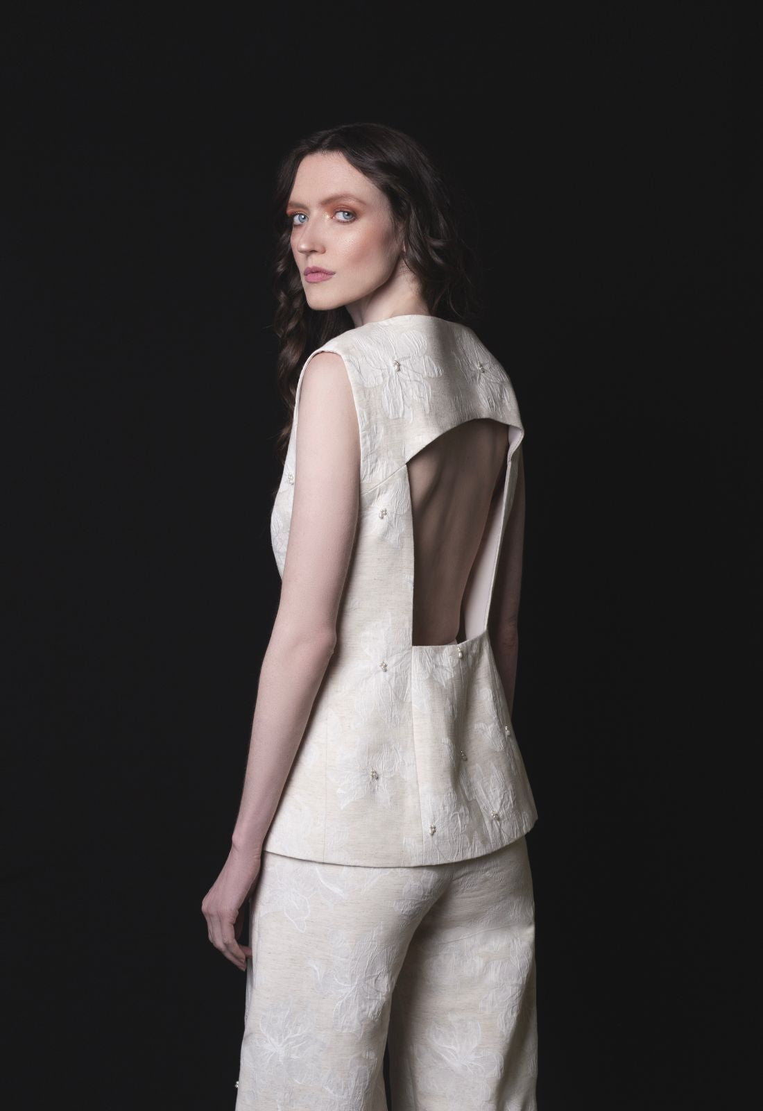 El chaleco ARTEMISA celebra la transformación de la tristeza en poder femenino. Su escote profundo y abertura en la espalda aportan una feminidad audaz, mientras que el bordado en perlas sobre jacquard adorna el diseño con un detalle exótico y refinado. Esta pieza única captura la esencia de la fuerza y la elegancia en perfecta armonía. Una declaración de estilo que invita a celebrar la individualidad con sofisticación.