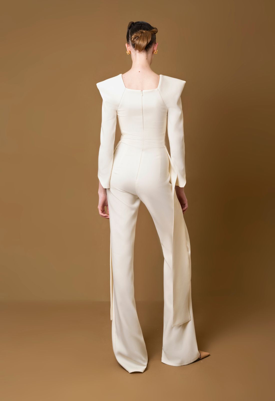 Enterizo de manga larga, con hombros que incorporan pliegues formando punta. Presenta diseño en los costados con piezas sobrepuestas y caída libre desde la cadera hasta el piso. Incorpora bota recta y sistema de cierre en el centro de la espalda.