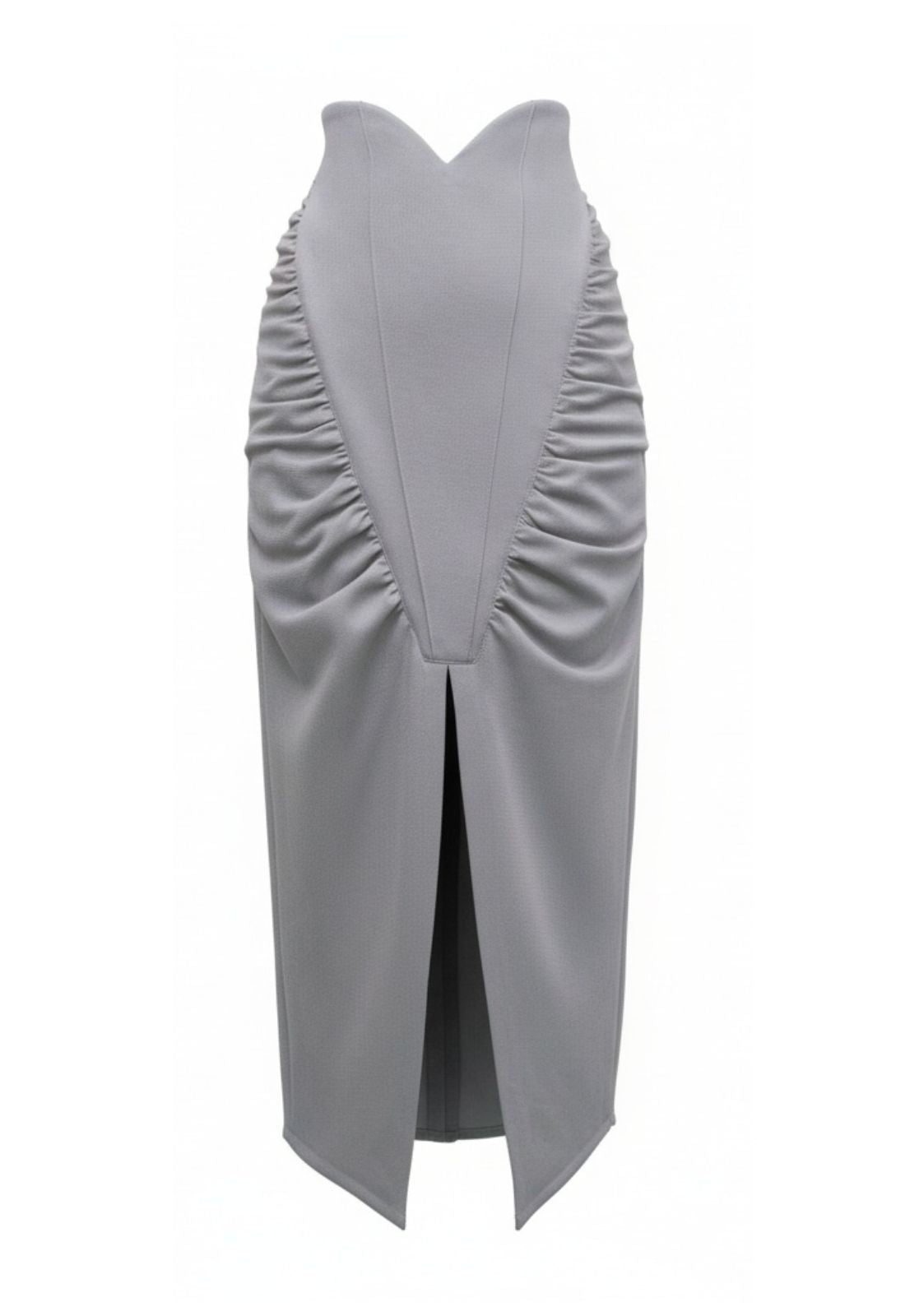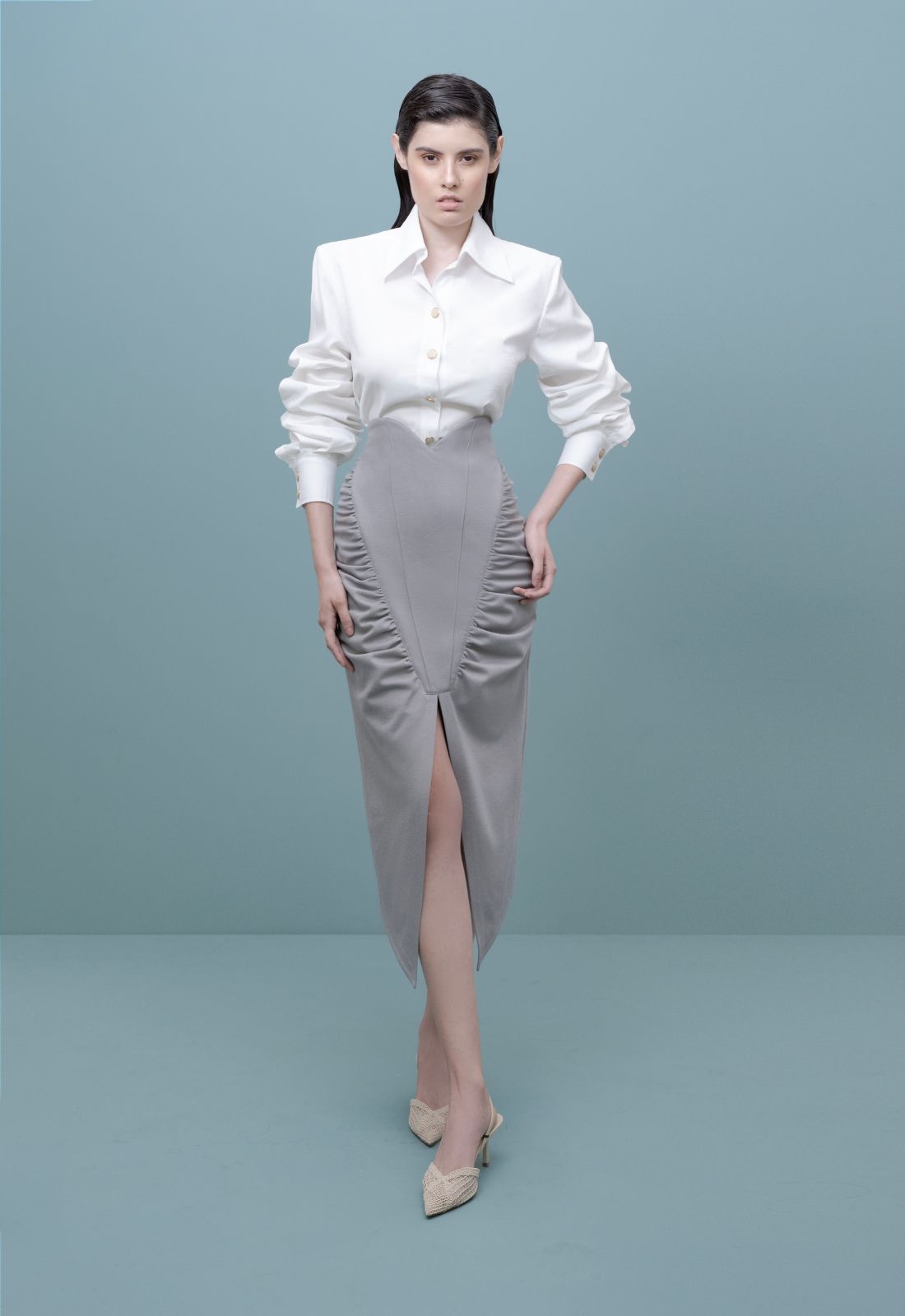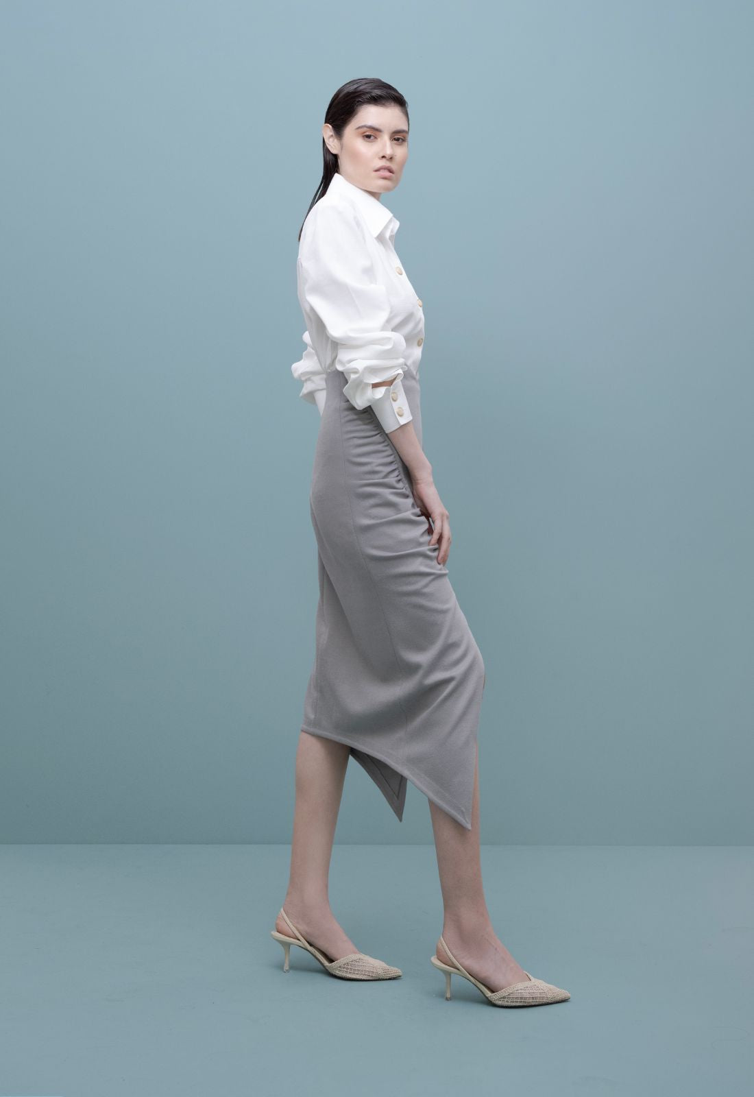 Presentamos nuestra falda LLAVE, una pieza que redefine la elegancia femenina desde la estructura suave y el detalle preciso. Su tiro alto enmarca la cintura en forma de corazón, mientras la pieza central que genera un efecto visual que larga las piernas y define la figura. Los frunces laterales acompañan el cuerpo con suavidad, aportando textura. Una abertura en todo el centro frente que añade un gesto femenino y sutilmente sensual .