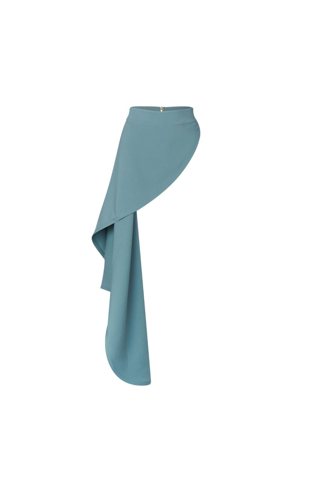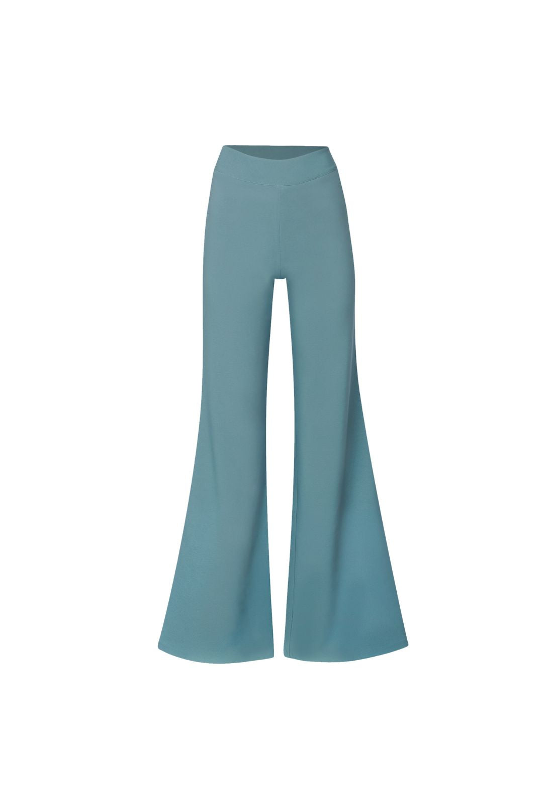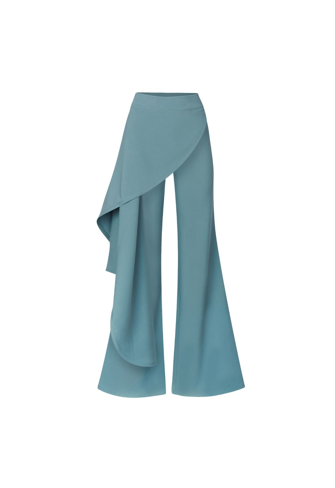 Pantalón tiro alto de dos piezas con bota Palazzo y peplum asimétrico con caída sobre la pierna derecha, cremallera invisible en espalda.
