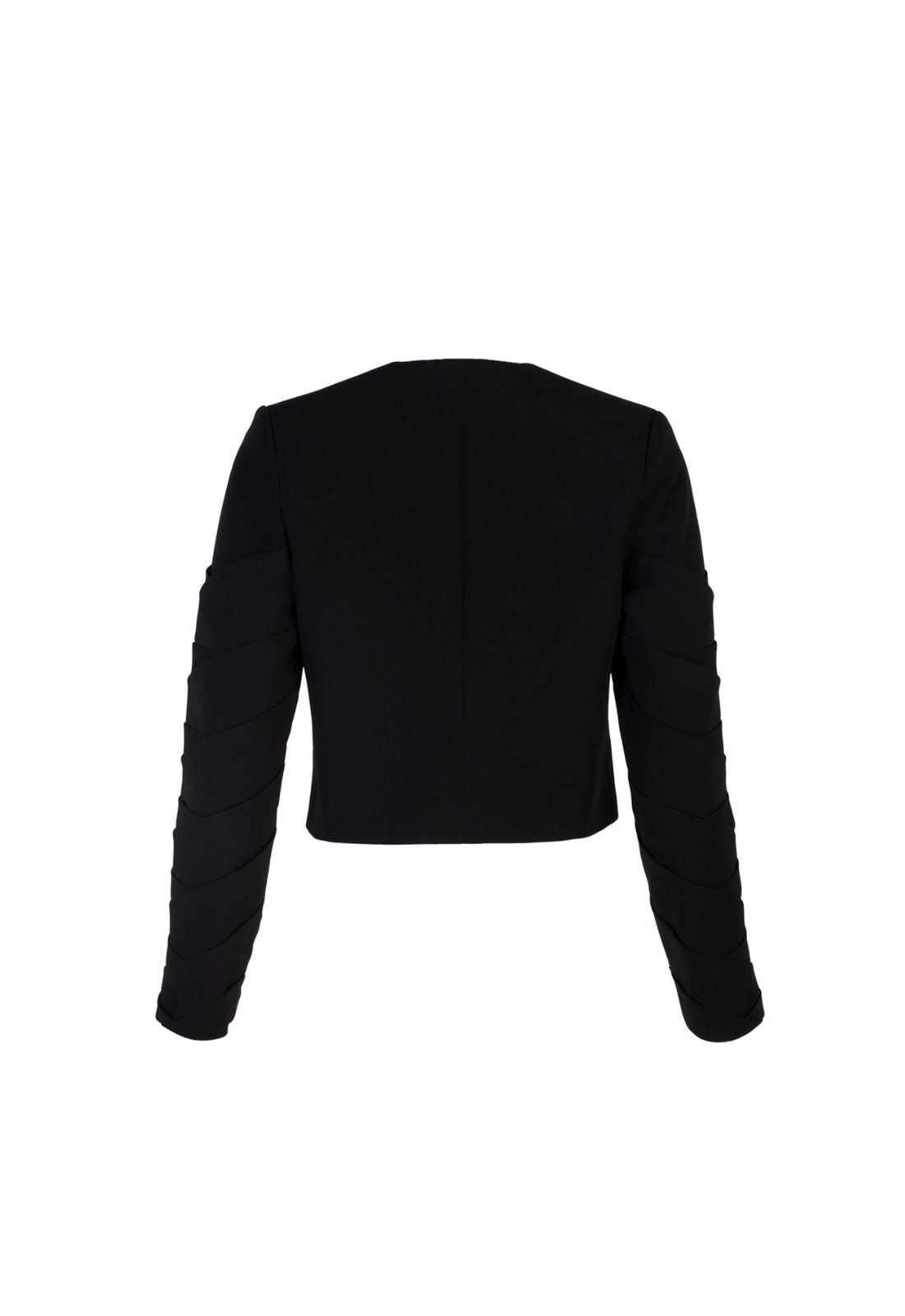 Chaqueta Poder corta con cuello redondo, doble botonadura estilo militar, mangas trenzadas y bolsillo interno.