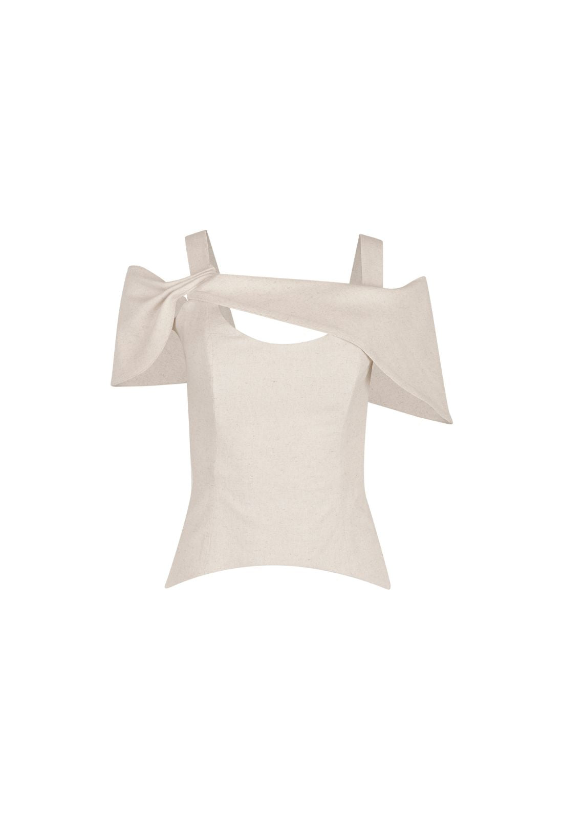 Blusa con diseño cóncavo en cadera y tiras en hombros, con asimetría en mangas. Totalmente entalegado en la misma tela y cremallera separabla en la espalda.